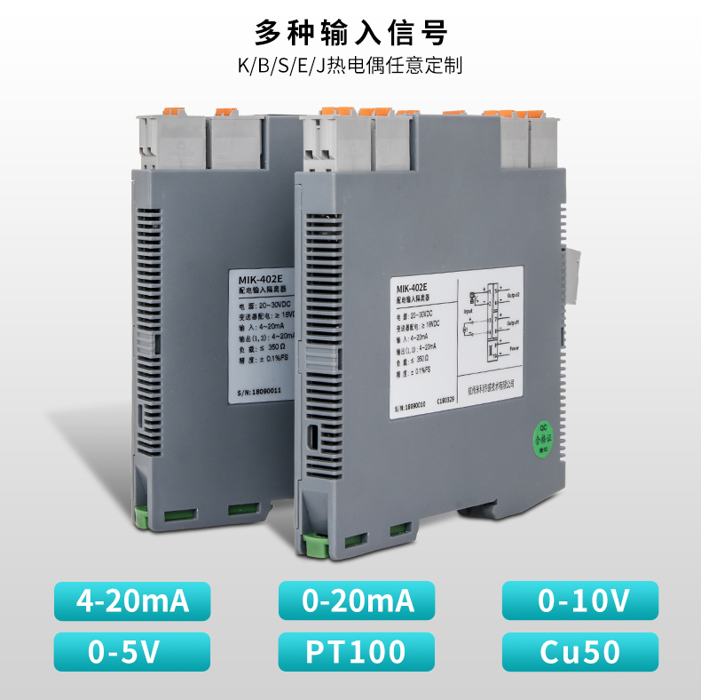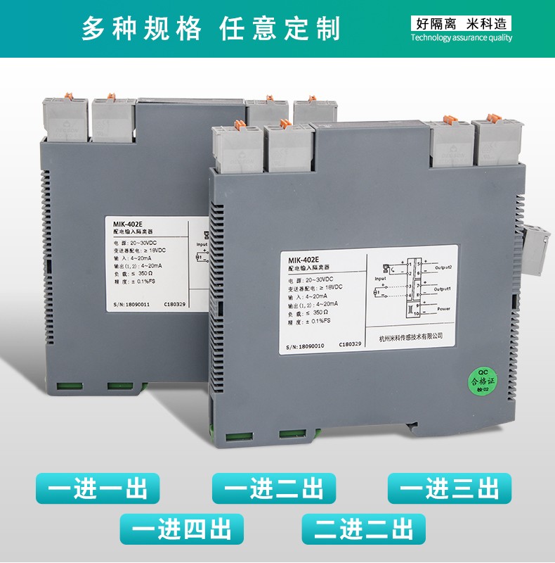 MIK-402E系列信號隔離器,電壓、電流隔離器將直流電壓或電流信號經過隔離傳送,轉換成所需的信號給其他儀表。可以與單元組合儀表及DCS、PLC等系統配套使用,給予現場儀表信號隔離、信號轉換、信號分配、信號處理等,從而提高工業生產過程自動控制系統的抗干擾性能力,保證系統的穩定性與可靠性。本產品品種分為一進一出、一進二出、一進三出、一進四出、二進二出,且輸入、輸出、電源三端隔離。并且大量運用于配電柜和隔離箱等各種工業場合。