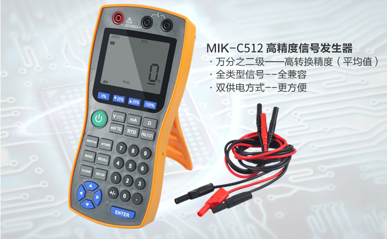米科MIK-C512信號發生器具有多種信號的測量和輸出功能,包括電壓、電流(含電子負載)、電阻、熱電偶分度值(可選擇冷端補償)、熱電阻分度值、脈沖頻率、配電等信號。操作簡單,待機時間長,精度高,并且具有可編程輸出的功能。