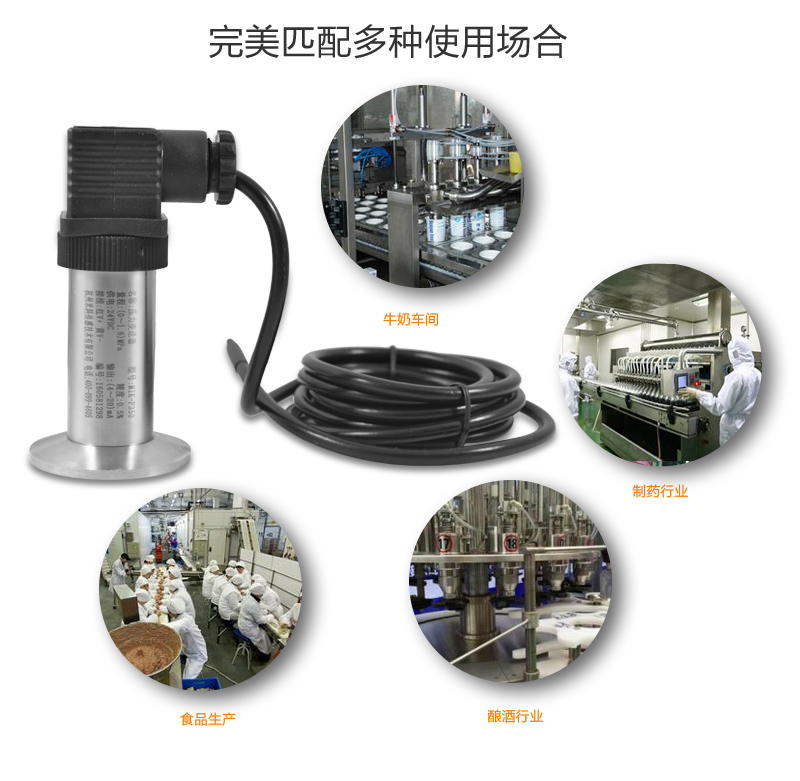 適用場合:MIK-P350系列平面膜結構壓力變送器選用德國進口擴散硅芯體,采用平面膜直接感受壓力。傳感器接口有卡箍式,M27×2,法蘭式可供選擇。輸出信號有電壓、電流、頻率信號等可選擇,傳感器平膜片防止了結垢,不衛生及粘稠液體堵塞等問題。廣泛應用于食品、醫藥、衛生及釀酒工業等部門。